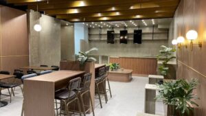 The minimalism, lighting, spaces, the use of wooden materials, neutral colors, and a touch of greenery represented by plants are the on-point features of the Japanese-inspired cafe.